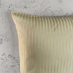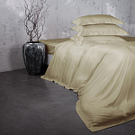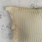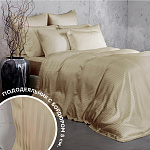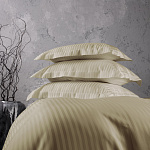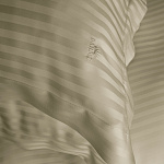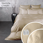 Комплект выполнен из ткани тенсель страйп однотонный, ширина полоски 1 см. Благодаря особому плетению, ткань похожа на шелк, но не скользит. Преимущество ткани в том, что она удерживает прохладу в жару и согревает в холод. Ткань обеспечивает комфортную температуру тела во время сна. Комплект дополнен декоративным бордюром шириной 5 см. и медальоном из ракушечника, а также  имеет вышивку бренда.