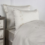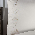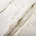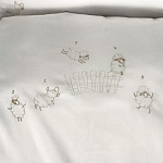 Пододеяльник - украшен вышивкой прыгающих через забор милых барашков. Дизайн вышивки продуман так, что ее можно сделать акцентом в верхней или нижней части пододеяльника. Именно поэтому застежка выполнена с боку пододеяльника и скрыта внутри. Застегивается на кнопки.