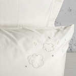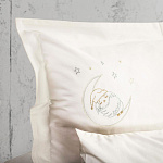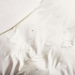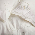 Пододеяльник украшен вышивкой ночного месяца в облаке и маленькими звездочками. Дизайн вышивки продуман так, что ее можно сделать акцентом в верхней или нижней части пододеяльника. Именно поэтому   застежка выполнена с боку пододеяльника и скрыта внутри. Застегивается на кнопки.